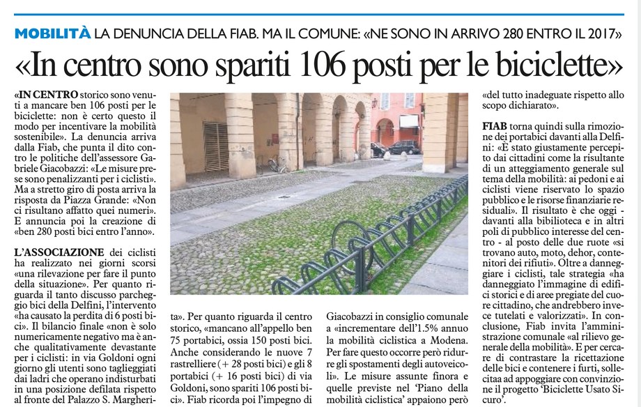 Lei accusa la Fiab di aver riportato informazioni “scorrette e fuorvianti” per indurre i cittadini a sostenere una petizione contraria all’iniziativa dell’Amministrazione comunale (eliminazione dei portabici all’ingresso della Biblioteca Delfini), concludendo che  “non è mai esistita nessuna intenzione di eliminazione dei portabici dal Centro Storico”.