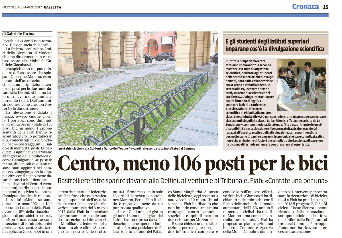 NOTALa foto allegata riguarda via Goldoni 5 dove l’Amministrazione – nell’ottobre 2016 – ha installato 7 vecchie rastrelliere al posto di 4 portabici ‘Modena’ (quelli a forma di P), nell’ambito della rimozione dei portabici all’ingresso della Biblioteca Delfini. Collocare vecchie rastrelliere al posto dei moderni portabici rappresenta un’offesa al buon senso.