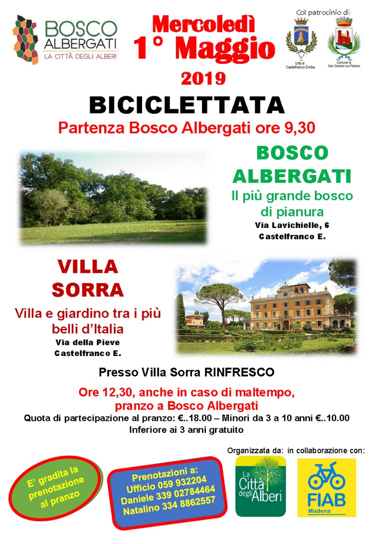 L’iniziativa è organizzata dall’Associazione “La Città degli Alberi” con quale la Fiab di Modena collabora nell’organizzazione della biciclettata. L’Associazione organizzatrice cura il parco ora conosciuto come ”Bosco Albergati “ ma che, in realtà il nome con cui fu battezzato era tutt’altro, infatti nel 1990 per volontà dell’amministrazione comunale e della cooperativa agricola che possedeva l’area, e grazie all’ispirazione e al progetto dell’architetto Cesare Leonardi questo luogo fu chiamato proprio “La Città degli Alberi”.