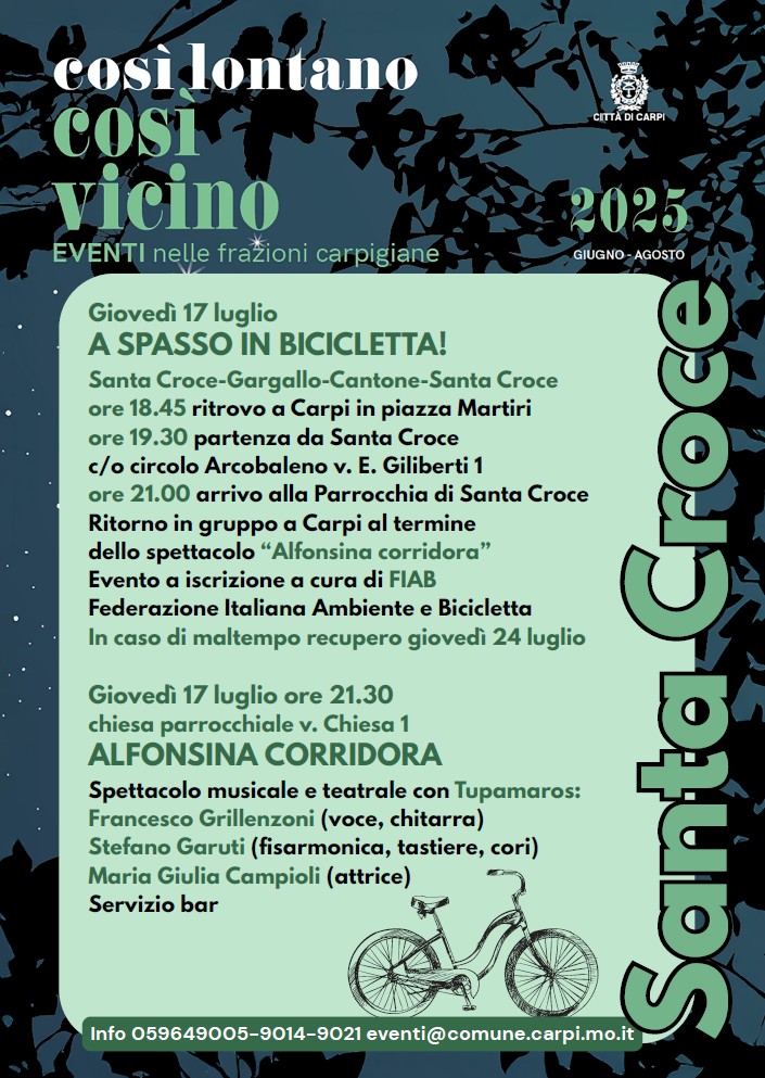 Evento nell’ambito degli Eventi del Comune di Carpi – Iscrizione a cura di FIAB Federazione Italiana Ambiente e Bicicletta – Prenotazioni: Mara 3281399914 – Roberta 3792547035