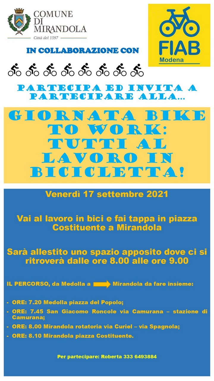 In occasione della giornata nazionale del Bike2Work anche i cittadini di Mirandola avranno la possibilità di provare “l’avventura” di andare al lavoro in bicicletta. Per la “prima” mirandolese abbiamo pensato di organizzare il viaggio dalla vicina località di Medolla, per arrivare fino in Piazza deIla Costituente a Mirandola. Questo il programma per chi si vuole aggregare lungo il percorso: