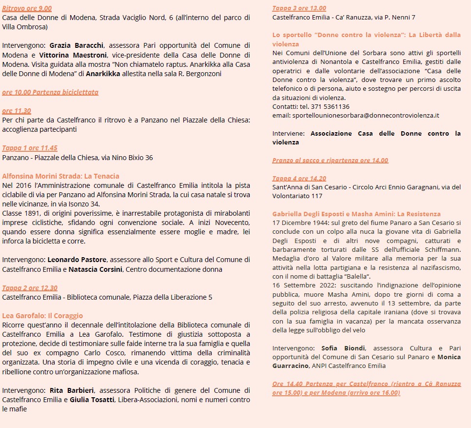 Tappa 3 ore 13.00 – Castelfranco Emilia – Ca’ Ranuzza, via P. Nenni 7 – Lo sportello “Donne contro la violenza“: La Libertà dalla violenza Nei Comuni dell’Unione del Sorbara sono attivi gli sportelli antiviolenza di Nonantola e Castelfranco Emilia, gestiti dalle operatrici e dalle volontarie dell’associazione “Casa delle Donne contro la violenza” , dove trovare un primo ascolto telefonico o di persona, aiuto e sostegno per percorsi di uscita da situazioni di violenza. Contatti: tel. 371 5361136 email: sportellounionesorbara@donnecontroviolenza.it Interviene: Associazione Casa delle Donne contro la violenza – Pranzo al sacco e ripartenza ore 14.00