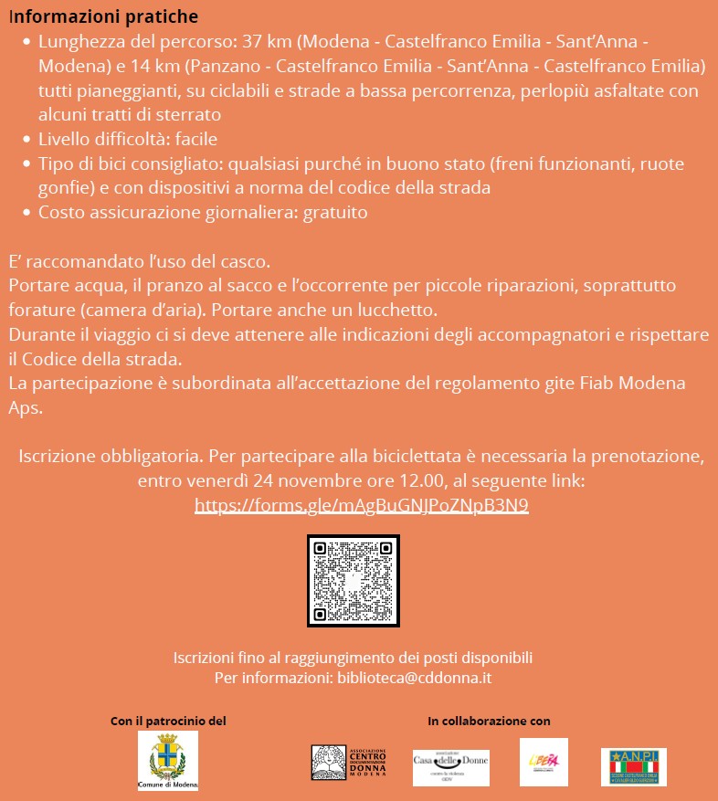 • Informazioni pratiche: E’ raccomandato l’uso del casco. Portare acqua, il pranzo al sacco e l’occorrente per piccole riparazioni, soprattutto forature (camera d’aria). Portare anche un lucchetto. Durante il viaggio ci si deve attenere alle indicazioni degli accompagnatori e rispettare il Codice della strada. La partecipazione è subordinata all’accettazione del regolamento gite Fiab Modena Aps.