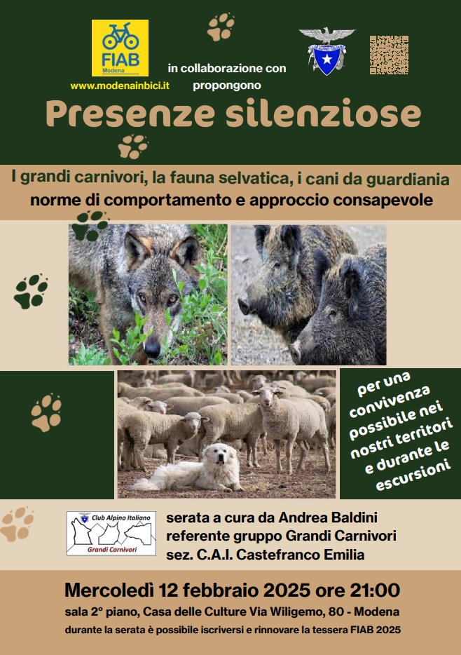 Con Andrea Baldini (Referente Sezionale del Gruppo Grandi Carnivori del CAI – Castelfranco Emilia) affronteremo questo aspetto di grande attualità, soprattutto per chi come noi spesso affronta escursioni nella natura. Lupi, orsi, cinghiali e cani da guardia sono presenze naturali con cui la convivenza è possibile nei nostri territori e durante le escursioni.