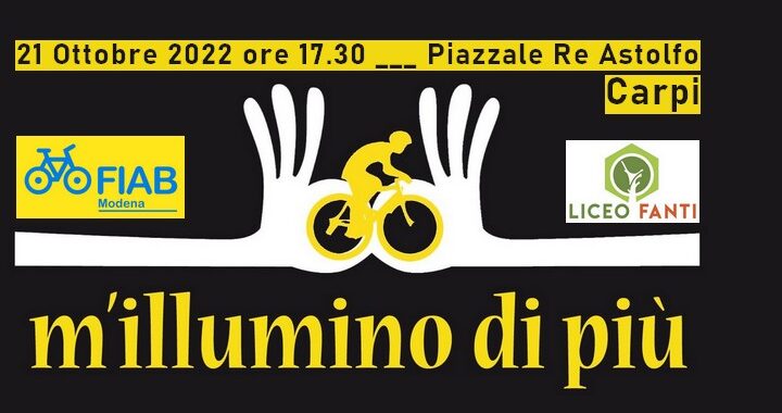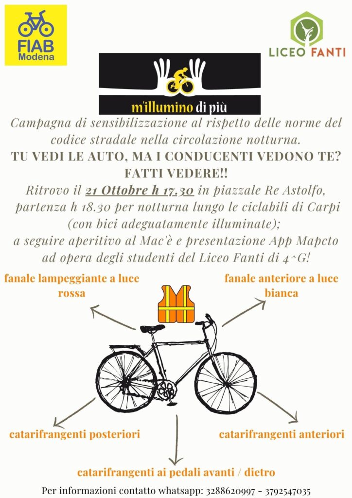 Questa volta ci troviamo in piazzale Re Astolfo a Carpi, dove dalle 17.30 un nostro banchetto informativo accoglierà tutti i ciclisti e daremo i consigli sui dispositivi di illuminazione, mentre i ragazzi del Liceo Fanti saranno disponibili per spiegare l’ APP Mapcto, che loro stessi hanno sviluppato per guidare i cittadini tra la rete delle infrastrutture ciclabili carpigiane.