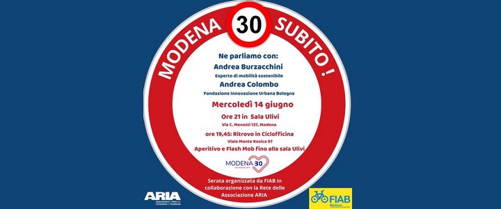 Le realtà aderenti ad ARIA e FIAB Modena (Associazioni in Rete per l’Inclusione e l’Ambiente) e FIAB Modena promuovono un incontro aperto a tutta la cittadinanza in cui illustrare le ragioni e le modalità con le quali una moderna città europea come Modena dovrebbe adottare da subito il limite generalizzato dei 30km/h.