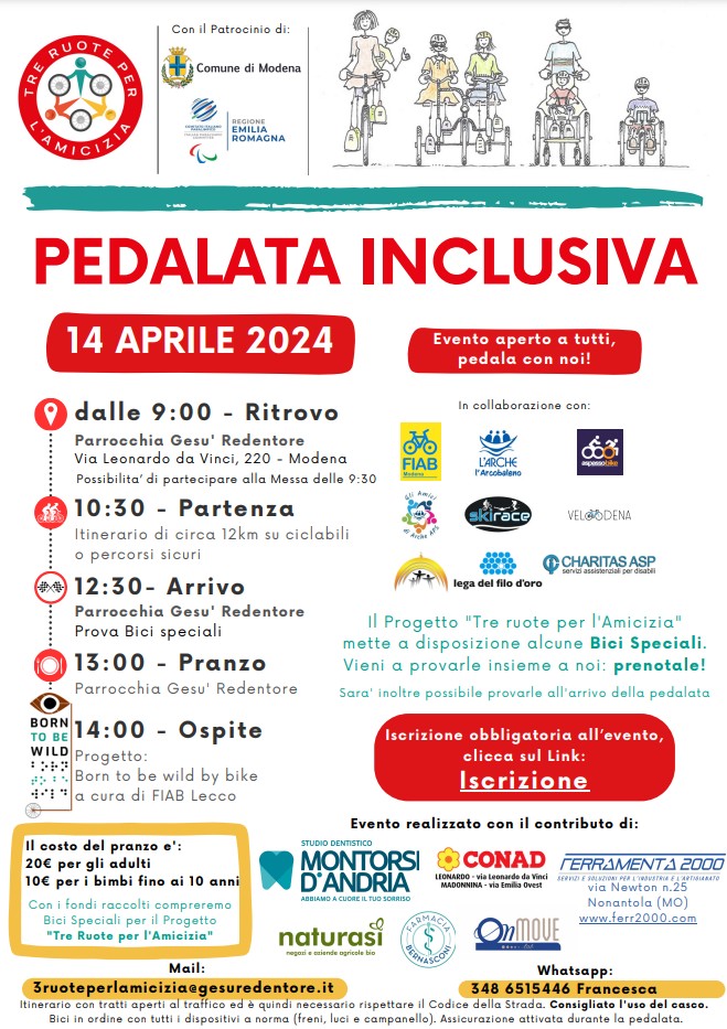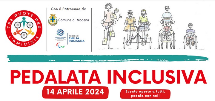 La pedalata a supporto del progetto è prevista per domenica 14 aprile 2024 a partire dalle 10.30 presso la Casa della Carità della Parrocchia Gesù Redentore, dove una carovana di persone provenienti da tutta Italia pedaleranno su un percorso ad anello di circa 15km sulle ciclabili modenesi. Sarà un momento di festa e l’occasione per tutti i cittadini modenesi di poter accompagnare con le loro biciclette queste persone, e poter provare le qualità di queste bici a 3 ruote.