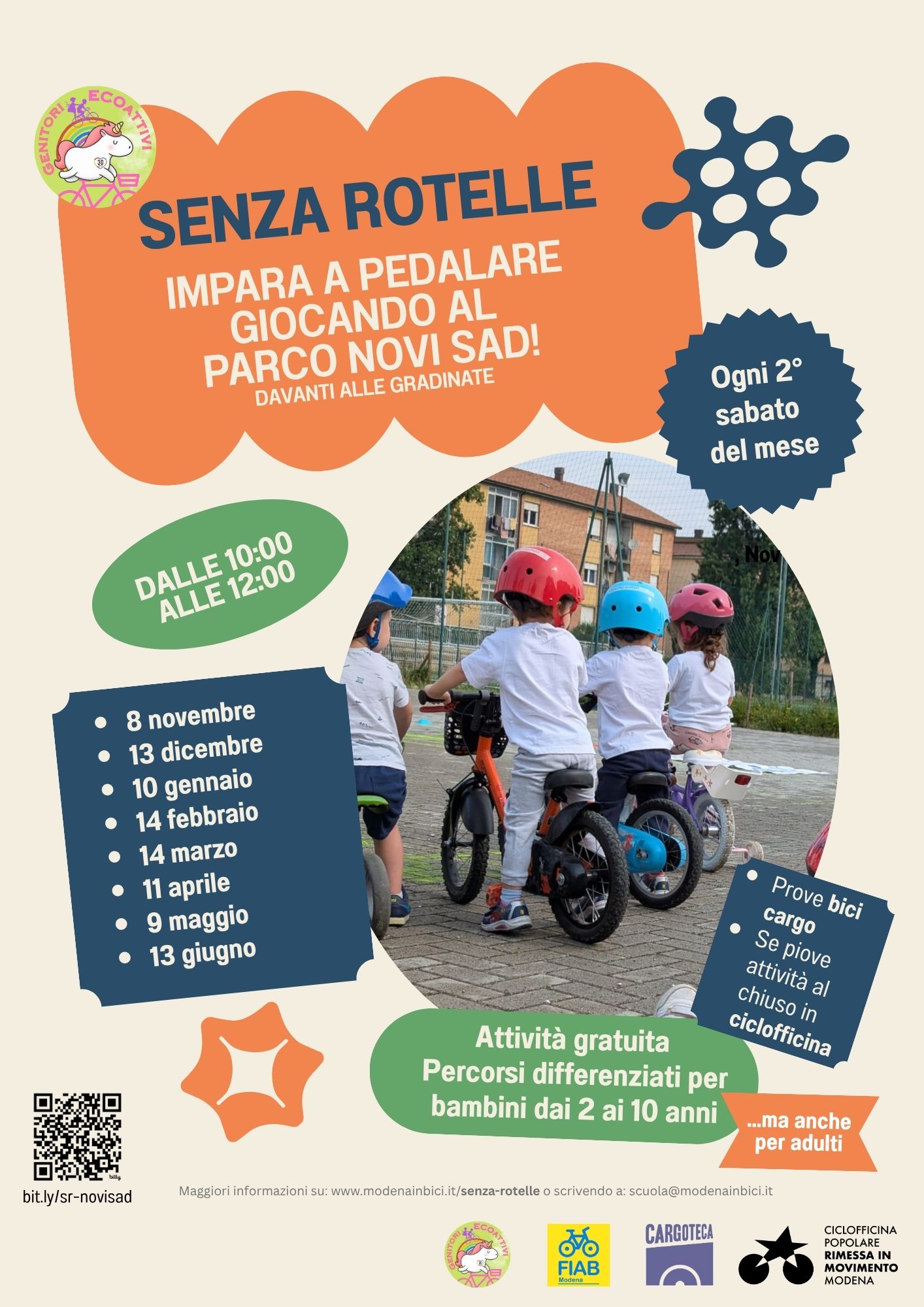 Evento per famiglie, bambini dai 2 anni in su e possibilità di supporto anche per i genitori o gli adulti che non sanno andare in bici o desiderano migliorare per andarci in sicurezza.