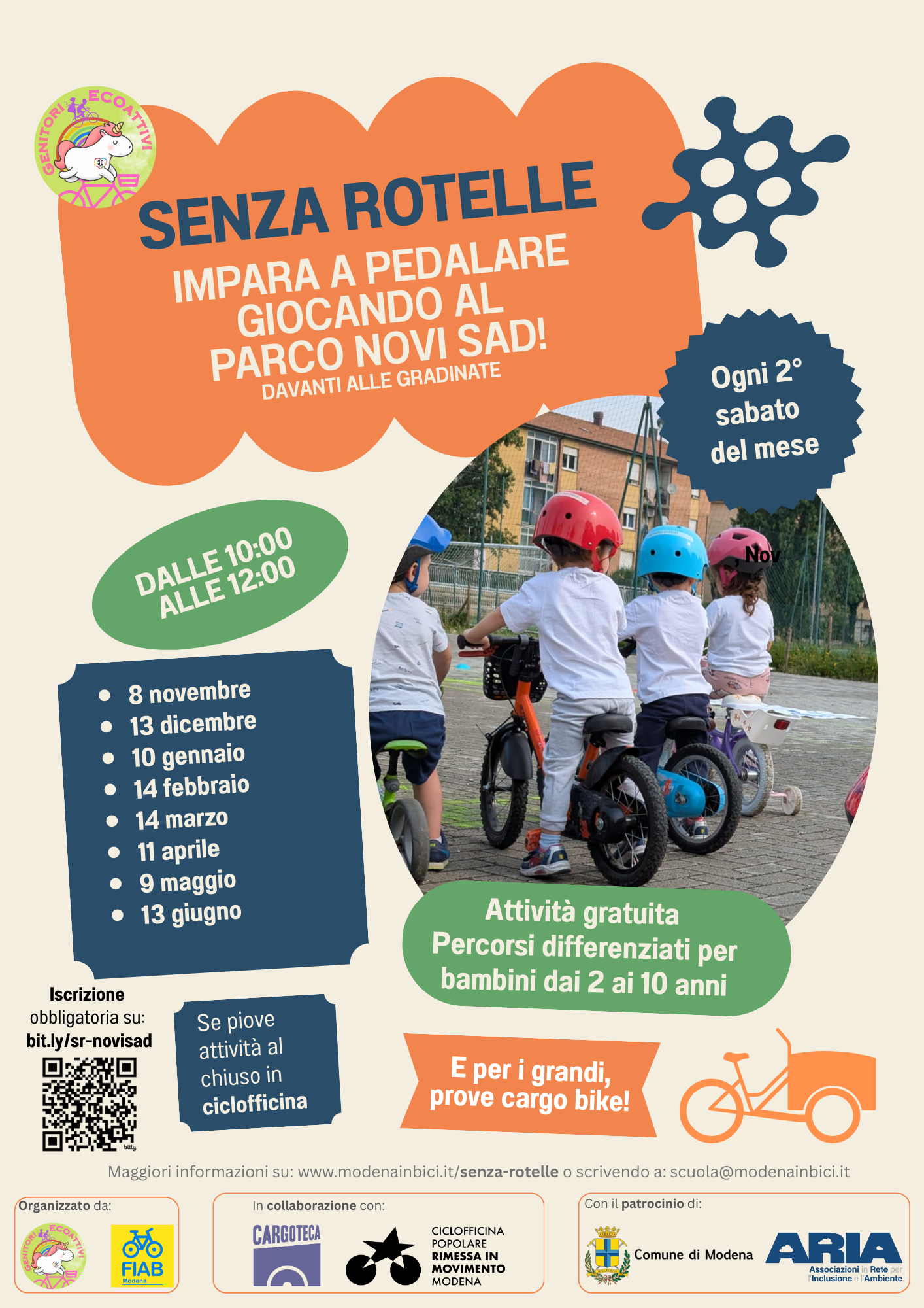 Evento per famiglie, bambini dai 2 anni in su e possibilità di supporto anche per i genitori o gli adulti che non sanno andare in bici o desiderano migliorare per andarci in sicurezza.