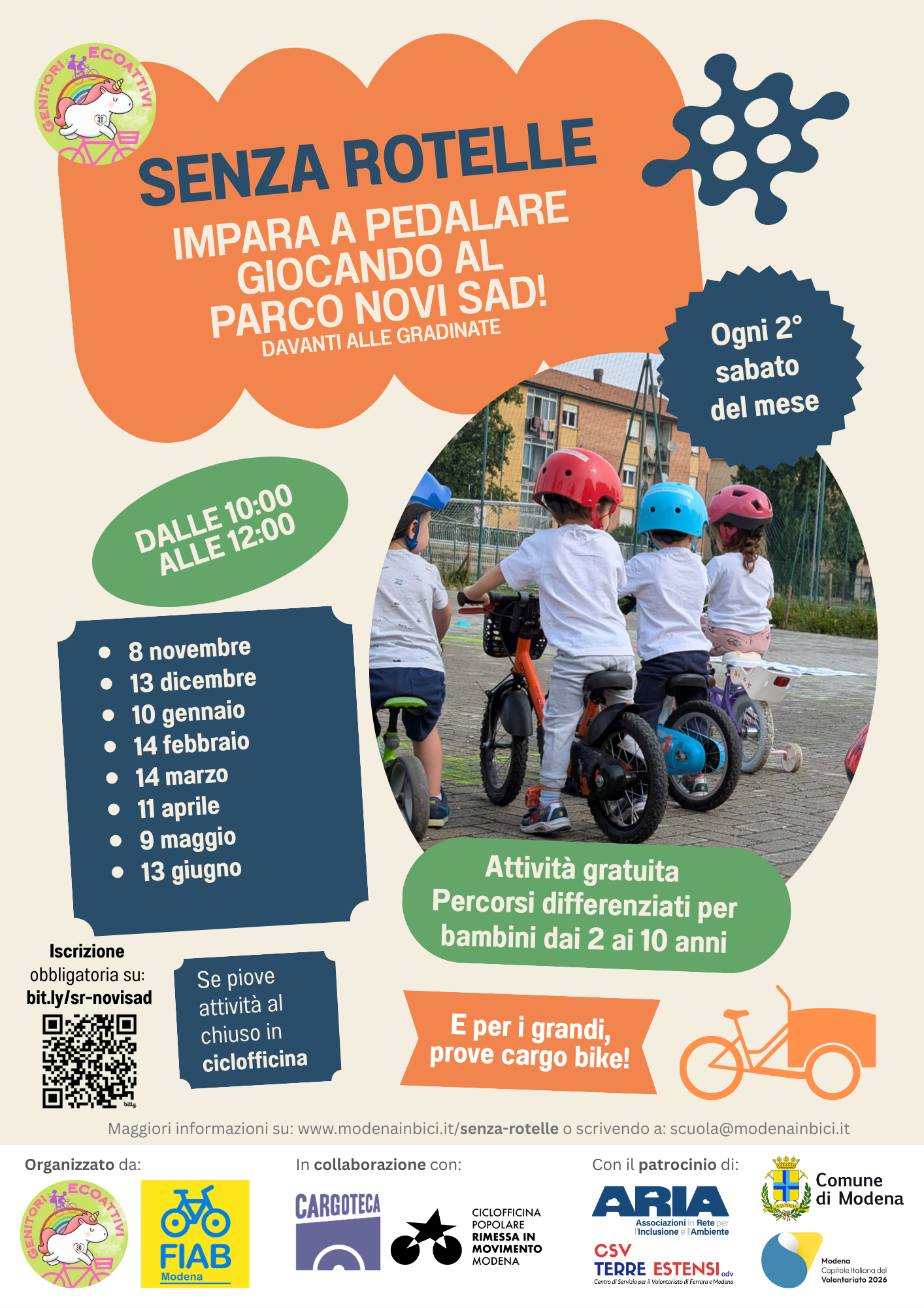 Evento per famiglie, bambini dai 2 anni in su e possibilità di supporto anche per i genitori o gli adulti che non sanno andare in bici o desiderano migliorare per andarci in sicurezza.
