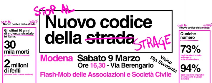 Modena, Sabato 9 Marzo alle 16:30 in Via Berengario di fronte al Dipartimento di Economia: Il flash-mob “Stop al Nuovo Codice della Strage”, all’interno della contro la revisione del Codice della Strada proposta dal Ministero delle infrastrutture e dei Trasporti.
