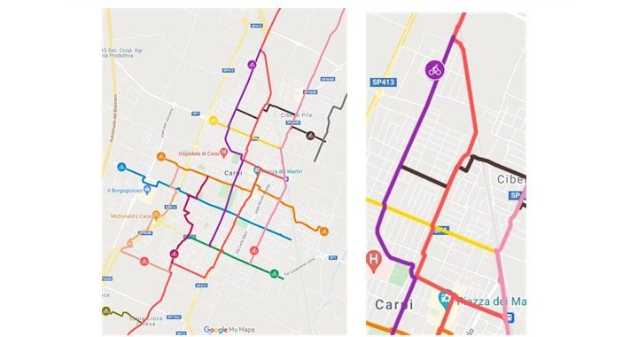 Carpi ha nuove tipologie di percorsi ciclabili che assieme alle tradizionali ciclabili e ciclopedonali creano la rete ciclabile urbana che può essere rappresentata con linee colorate e numerate.