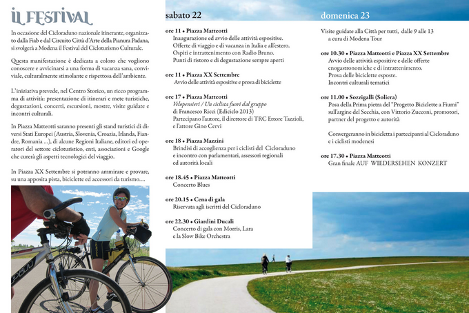 Dopo un periodo di prolungato letargo in questo settore, finalmente la Regione Emilia Romagna sembra essersi svegliata. A luglio, la Giunta regionale ha approvato un programma di ciclovie molto impegnativo, finalizzato proprio all’incentivazione del turismo a due ruote. Prevede la messa in rete di percorsi e piste ciclabili (esistenti e in progetto) per circa 3800 chilometri (ingloberà i percorsi previsti dal progetto della Fiab di Modena “Biciclette a fiumi”), intercettando le due dorsali nazionali: Bicitalia ed Eurovelo. Per fruire della nuova opportunità, la Regione installerà una segnaletica omogenea e predisporrà specifiche app per fornire informazioni utili ai turisti.