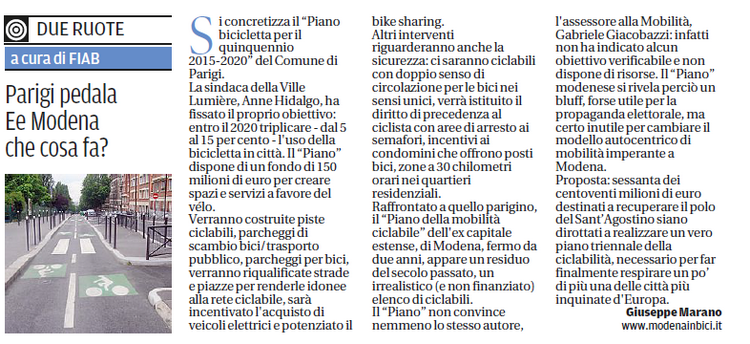 Raffrontato a quello parigino, il ‘Piano della mobilità ciclabile‘ dell’ex capitale estense, fermo da due anni, appare un residuo del secolo passato, un irrealistico (e non finanziato) elenco di ciclabili. Il ‘Piano’ non convince lo stesso autore, l’assessore alla mobilità, Gabriele Giacobazzi: infatti non ha indicato alcun obiettivo verificabile e non dispone di risorse. Il ‘Piano’ si rivela perciò un bluff, forse utile per la propaganda elettorale, ma certo inutile per cambiare il modello autocentrico di mobilità imperante a Modena.